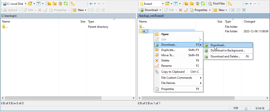You can download a backup using a file transfer client such as WinSCP or using the command line. The following example explains how to download a backup using WinSCP and FTP.