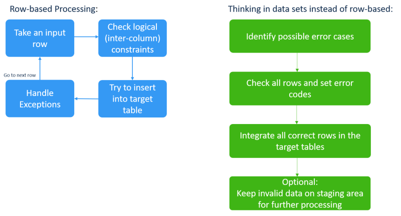 When transforming source data within Exasol, processing data as data sets is more efficient than row-based processing. When you transform data as data sets, the process is as follows: