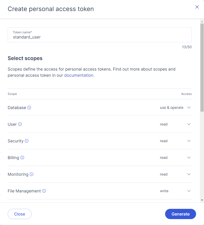Exasol SaaS has a number of pre-defined scope categories that control access to the database and the Rest API. When you create a PAT you must select at least one of the scopes described in the following table:
