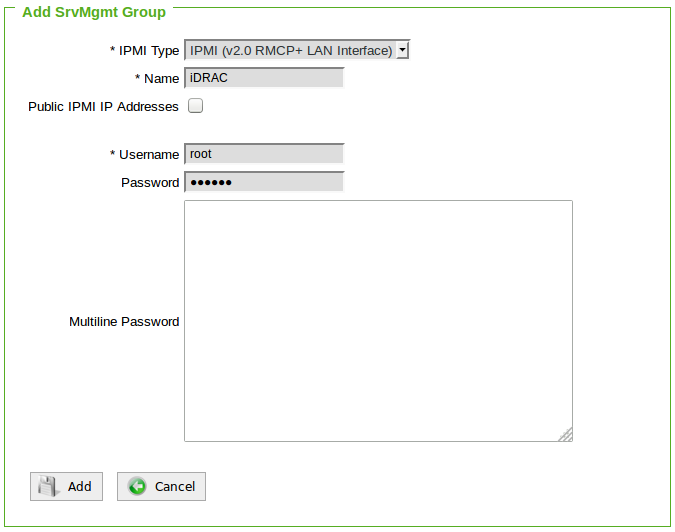 - Name: Name of the IPMI Group. Once created, it can be later assigned to an interface (e.g. iLO, iDRAC) or a MAC address.