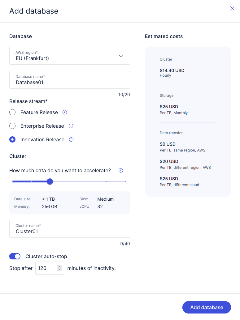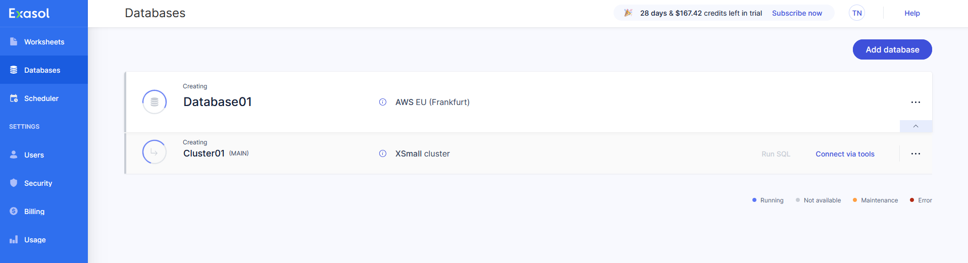 The first time you sign in, you will be asked to add a new database. If you are already signed in to Exasol SaaS, you can add a new database from the Databases page.