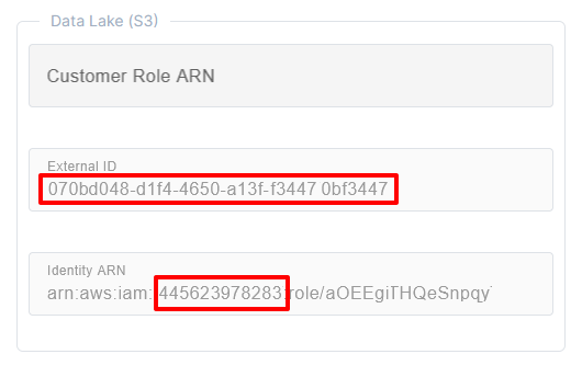 On the Settings tab, copy the contents of the External ID field and the the 12-digit AWS Account ID from the Identity ARN field.