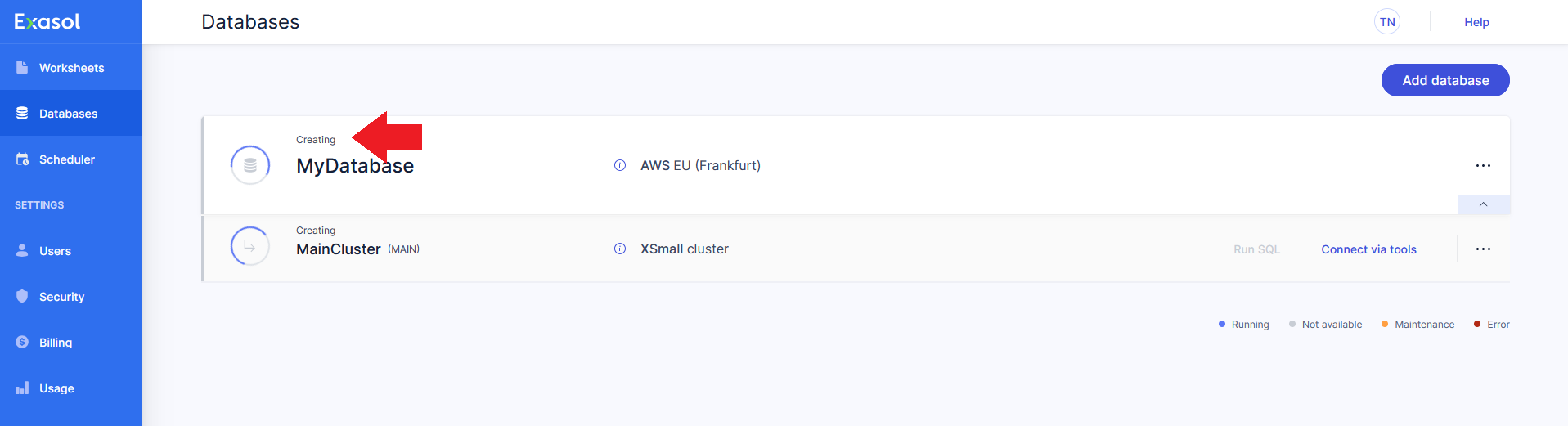 The first time you sign in to Exasol SaaS, you will be asked to add a new database.