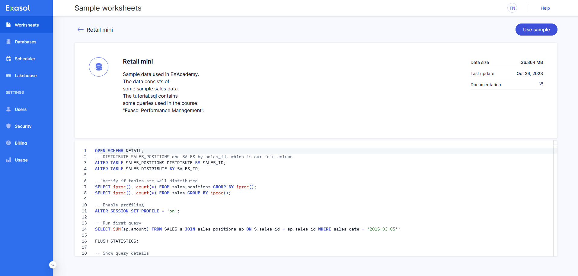 Click on Show queries in Retail mini to open the worksheet. The sample data in this dataset is also used in other tutorials in this documentation and in the Exasol training courses. Click on Use sample to continue.
