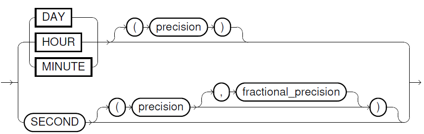 - time_expr specifies a time value in format HH[:MI[:SS[.n]]] or MI[:SS[.n]] or SS[.n]. Valid values are 0-23 for hours (HH), 0-59 for minutes (MI) and 0-59.999 for seconds (SS). The parameter precision defines the maximal number of digits for the leading field which allows you also to use larger numbers for hours, minutes and seconds as shown in the example table below. The parameter fractional_precision defines at which position the fractional part of the seconds are rounded (0-9, default is 3). In time_expr, you have to specify the whole used range, for example, HH:MI in case of HOUR TO MINUTE.
