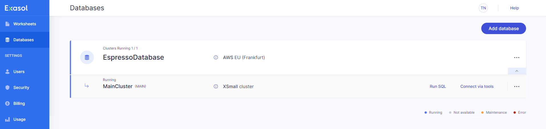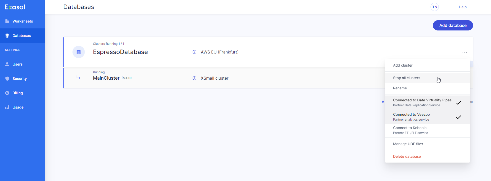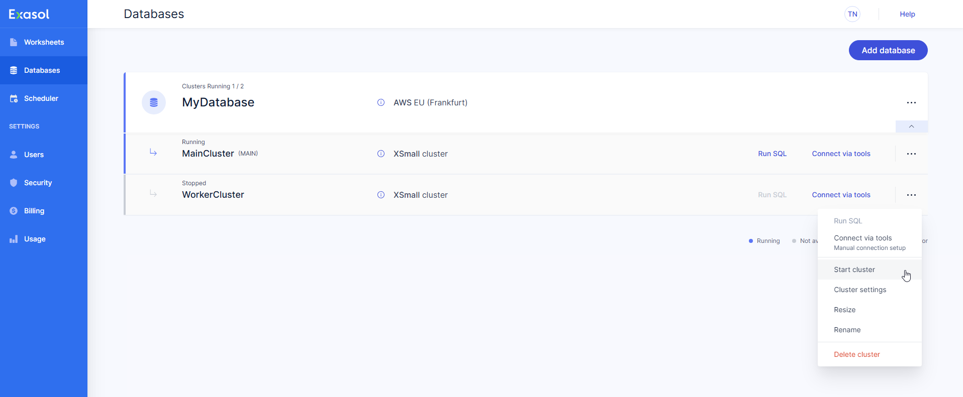 Learn how to start and stop clusters for an Exasol SaaS database.