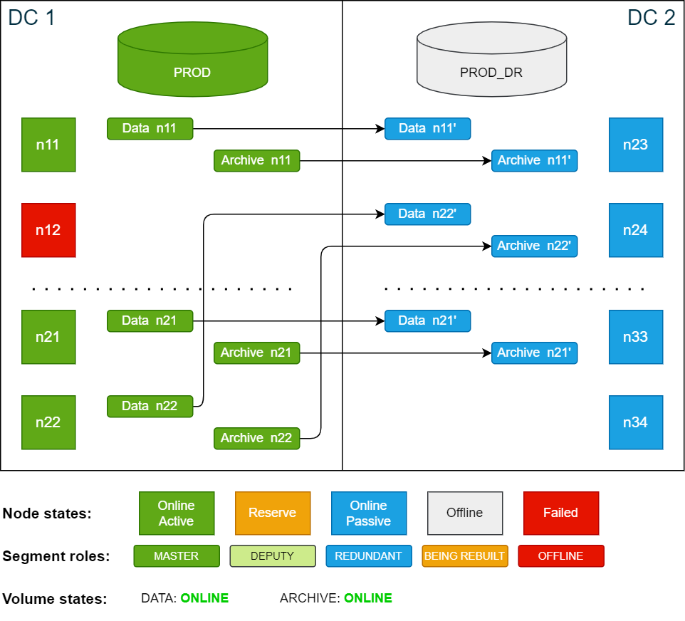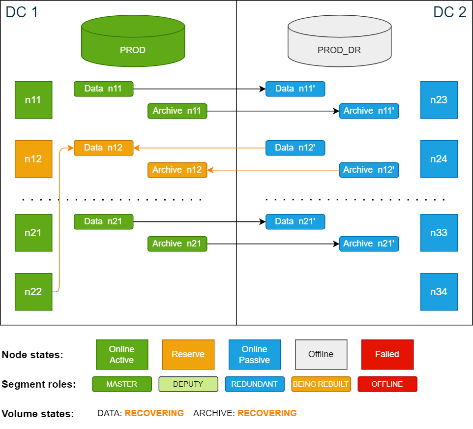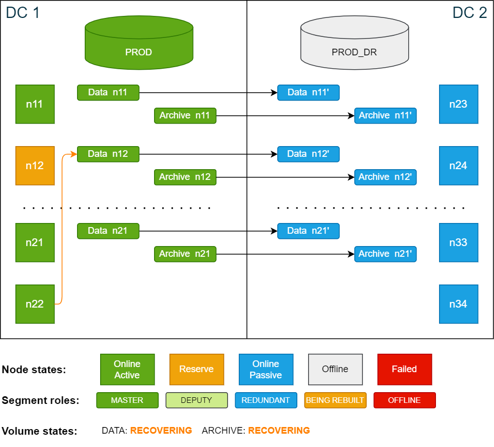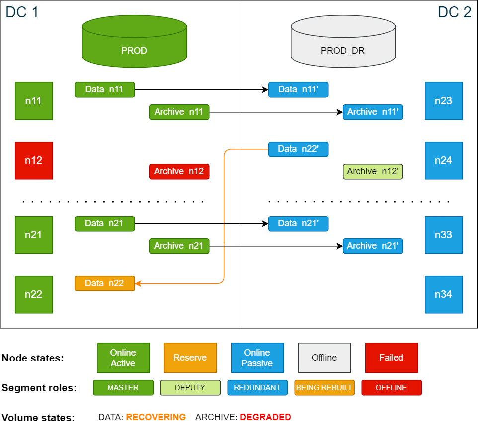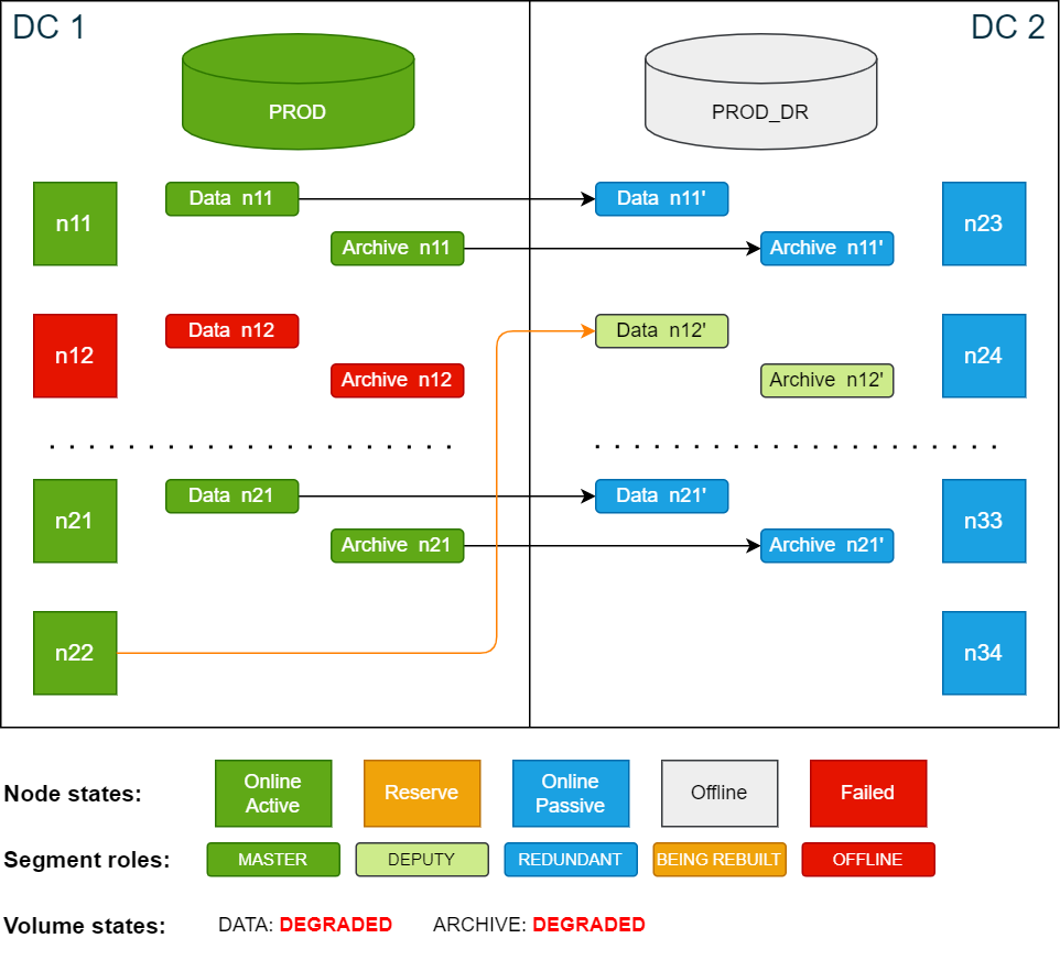 In this scenario the active node n12 in DC 1 fails and does not recover within the delay period. During the failover phase, node n12 is automatically replaced by the reserve node n22. Since the node is still offline, the data segments are automatically restored on the now active node n22 from redundant copies on node n24 in DC 2.