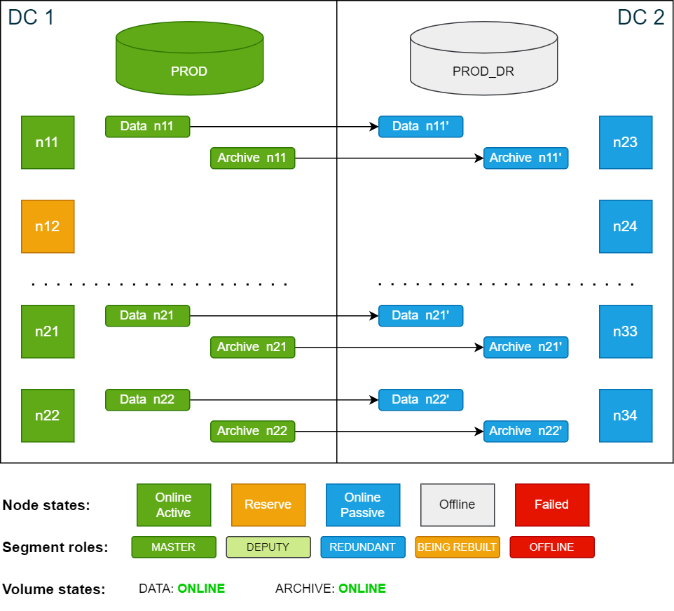 An active node is any node that is actively being used by a running database. In the following examples, nodes n11 to n21 in data center 1 (DC 1) are active nodes used by the PROD database during normal operation, while node n22 is defined as a reserve node.