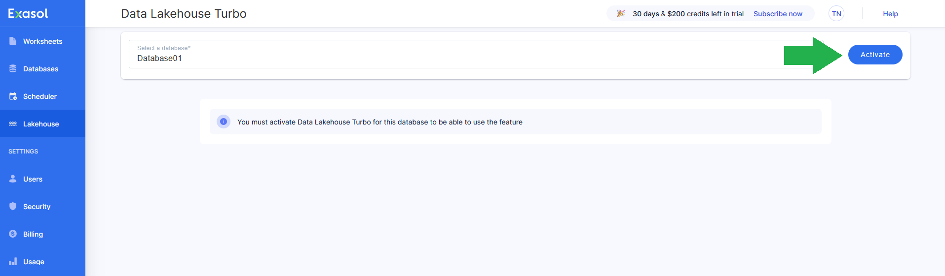 When your database is up and running, go to the Lakehouse page and click on Activate to activate Lakehouse Turbo for the selected database.