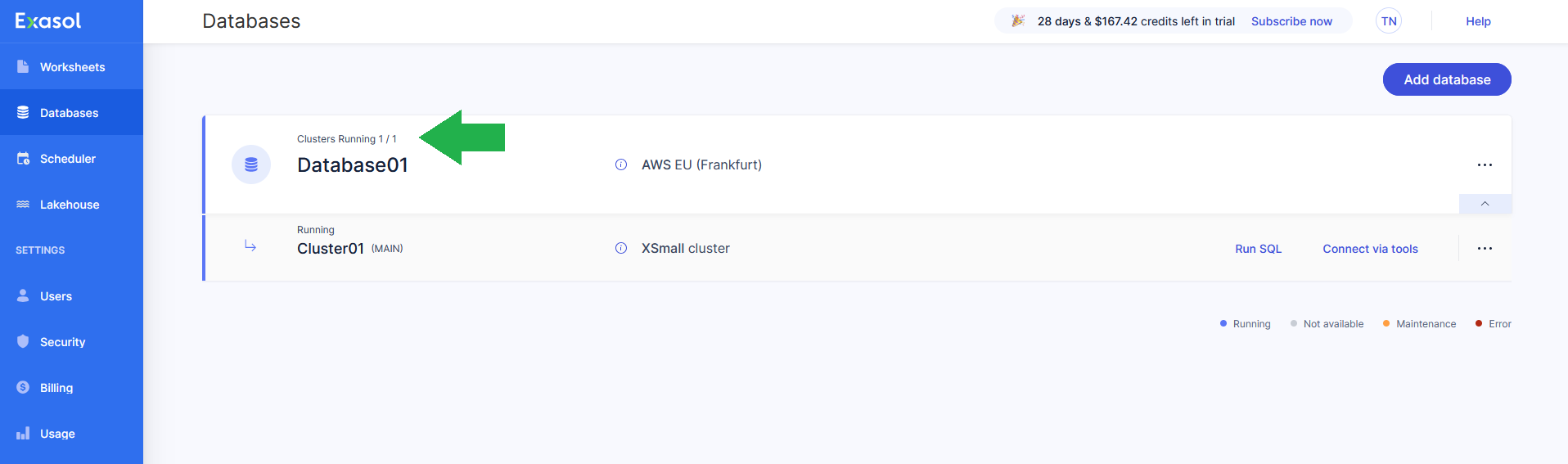 The first time you sign in, you will be asked to add a new database. If you are already signed in to Exasol SaaS, you can add a new database from the Databases page.