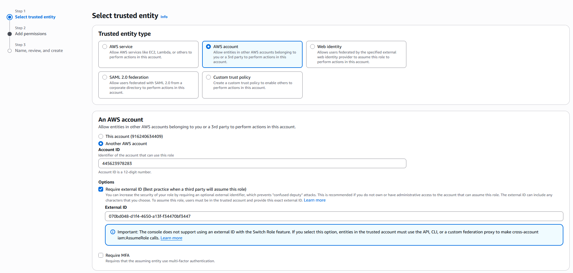 Another AWS Account -> Account ID = AWS Account ID copied from the Lakehouse Turbo Settings tab (see previous step)