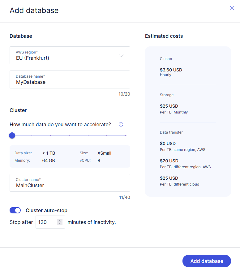 The first time you sign in to Exasol SaaS, you will be asked to add a new database.