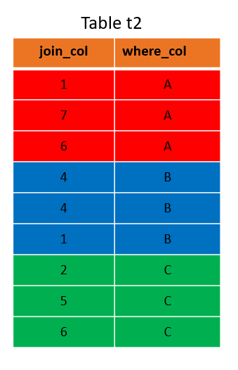 A statement like SELECT * FROM t2 WHERE where_col=’A’; would have to load only the red part of the table into memory. Should the two tables reside on a three-node cluster with distribution on the join_col columns and the table t2 partitioned on the where_col column, they look like this: