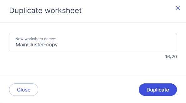 You can create a new worksheet by duplicating an existing worksheet. This will copy the settings and all saved SQL from the existing worksheet into a new worksheet.
