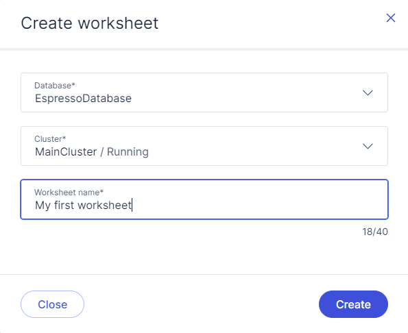 In the Create worksheet dialog that opens, select the desired database and cluster and give the worksheet a descriptive name. You can rename the worksheet later if needed.