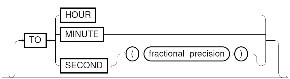 - time_expr specifies a time value in format HH[:MI[:SS[.n]]] or MI[:SS[.n]] or SS[.n]. Valid values are 0-23 for hours (HH), 0-59 for minutes (MI) and 0-59.999 for seconds (SS). The parameter precision defines the maximal number of digits for the leading field which allows you also to use larger numbers for hours, minutes and seconds as shown in the example table below. The parameter fractional_precision defines at which position the fractional part of the seconds are rounded (0-9, default is 3). In time_expr, you have to specify the whole used range, for example, HH:MI in case of HOUR TO MINUTE.